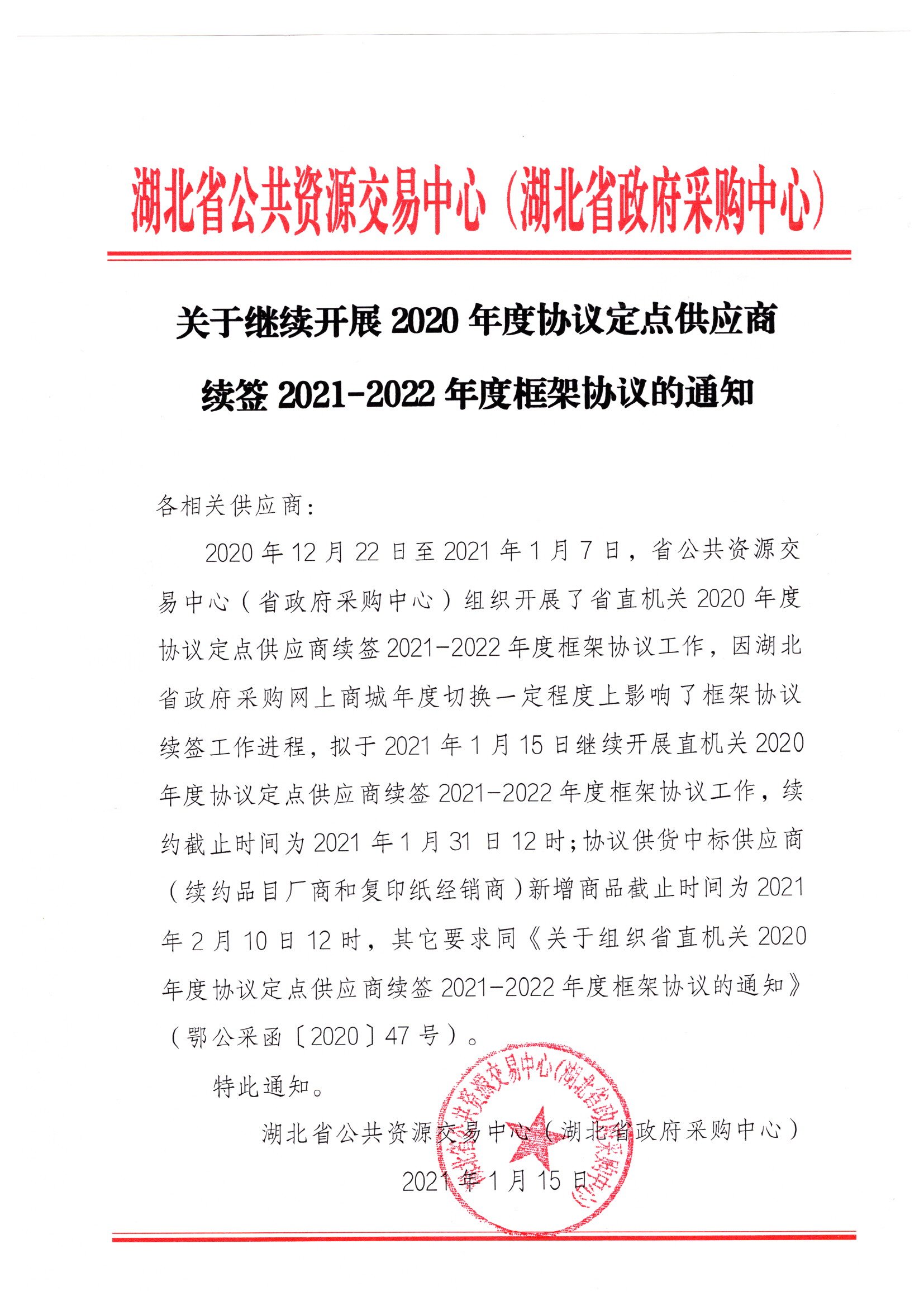 關于繼續開展2020年度協議定點供應商續簽2021-2022年度框架協議的通知