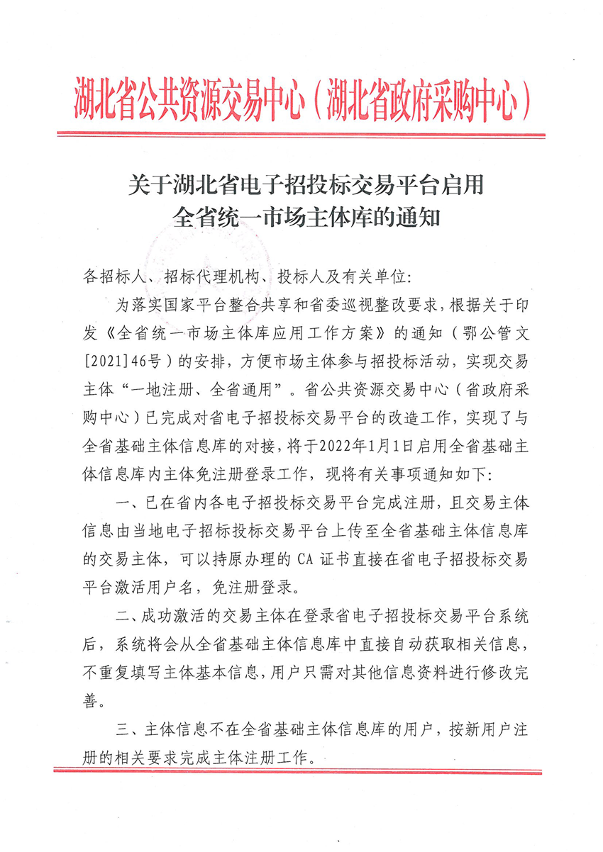 關(guān)于湖北省電子招投標(biāo)交易平臺(tái)啟用全省統(tǒng)一市場(chǎng)主體庫(kù)的通知