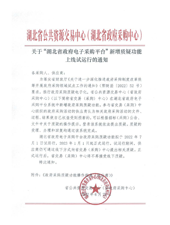 關于“湖北省政府電子采購平臺”新增質疑功能上線試運行的通知